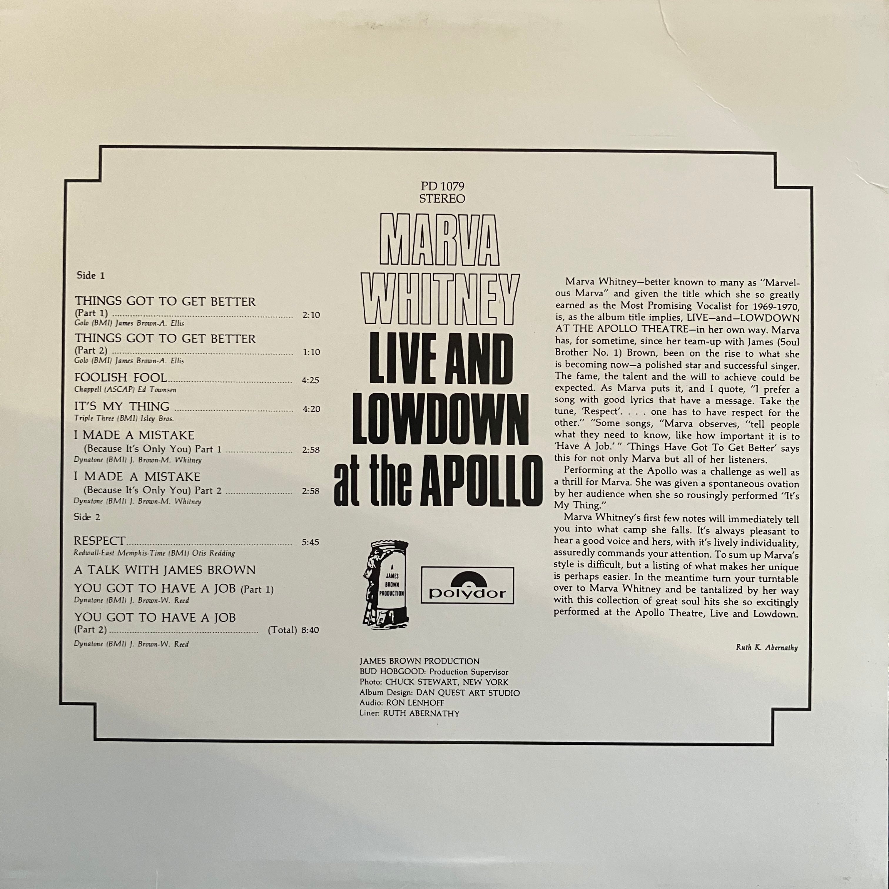 Soul sister Marva Whitneyさんのすさまじいソウルとファンクネス、アポロシアターでの熱唱。最高にソウルフルでファンキーな1枚。寒い時期に聴くと耳から熱くなる名盤。