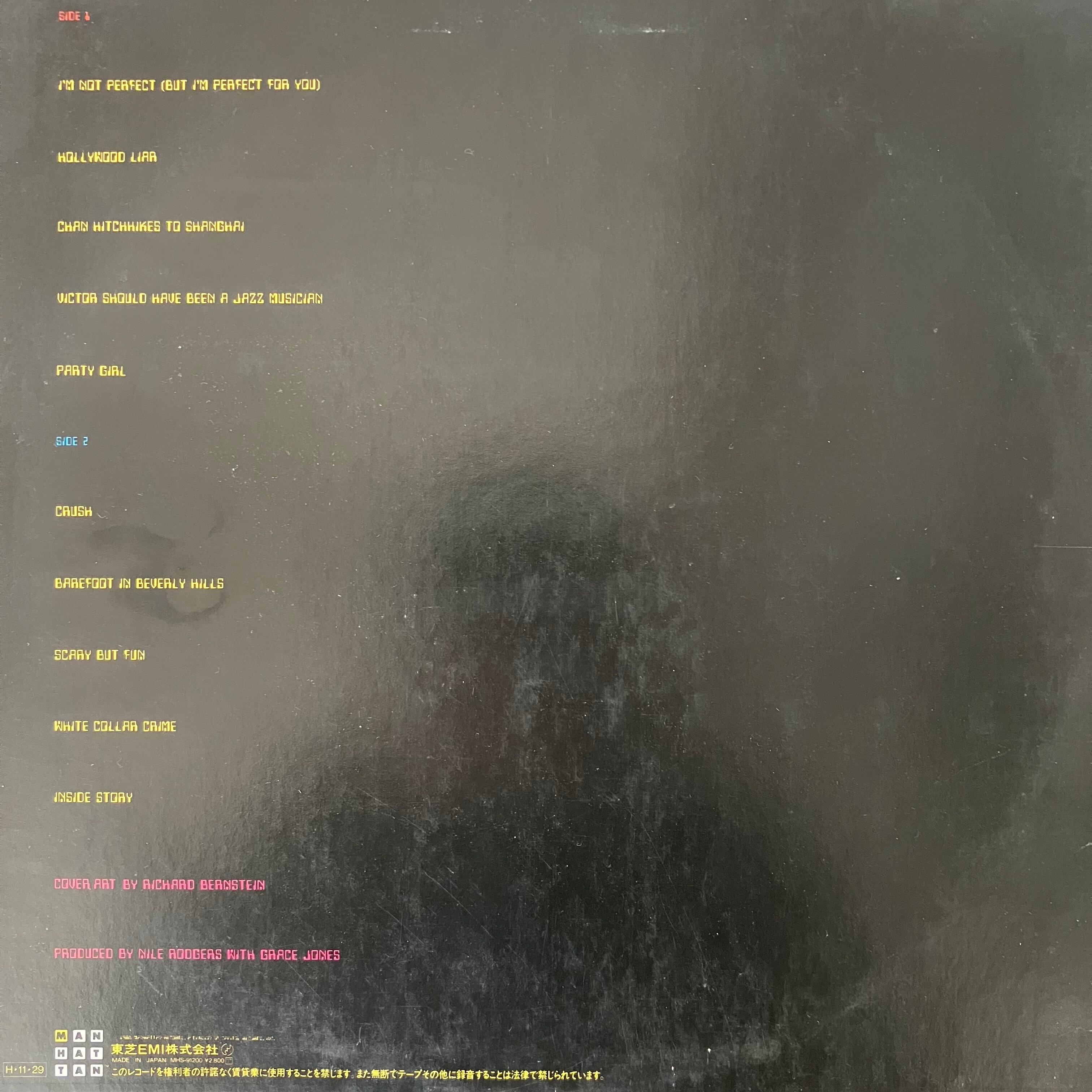 ジャマイカ出身アートカルチャー・アイコン的存在のアーティストGrace Jonesさん。1986'sリリース8作目。カラフルな耳の楽しいグルーヴィーな楽曲多。A-4バレアリック・スロー・ミッド・ブギー、上質アダルトな一枚。B-2パーカッションからの展開♪などなど。